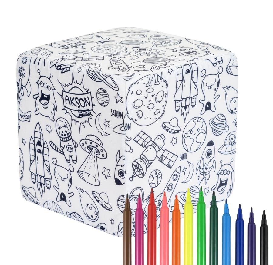 Kostka o wielkości 20 cm to miękka, wysokoelastyczna pianka oraz zdejmowany pokrowiec, który możesz wielokrotnie kolorować. Dzięki możliwości łatwego spierania kolorów kostka może służyć na wiele sposób i przy wielu okazjach.