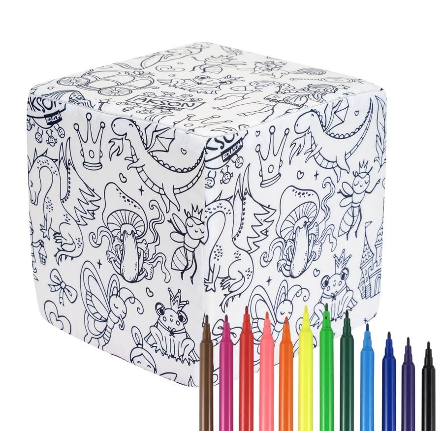 Kostka o wielkości 20 cm to miękka, wysokoelastyczna pianka oraz zdejmowany pokrowiec, który możesz wielokrotnie kolorować. Dzięki możliwości łatwego spierania kolorów kostka może służyć na wiele sposób i przy wielu okazjach.