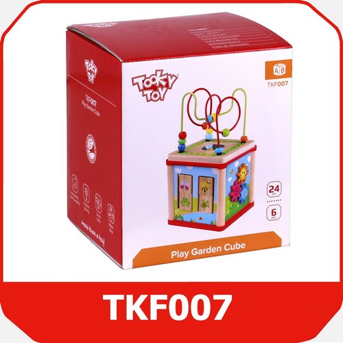 Kostka do zabawy to drewniana zabawka, której każda ze ścian ma zupełnie inną funkcjonalność i charakter. Jedna ze ścian zabawki to sorter z 4 klockami, który pozwala poznawać kształty, oraz rozwija manualne umiejętności dziecka. Druga ściana ma ruchome koła z trybikami, poruszenie jednego elementu, wprawia w ruch pozostałe. Na trzeciej ścianie ślimak i biedronka „ścigają się” na kolorowej łące. Czwarta ściana do ruchome klocki z wizerunkami zwierząt. Na górze zabawki znajduje się zdejmowana przeplatanka – labirynt z kolorowymi koralikami. Zabawki Tooky Toy są bezpieczne. Posiadają certyfikaty ekologicznych produktów. Pozbawione ostrych krawędzi, dobrze wygładzone, pomalowane są nietoksycznymi farbami i lakierami. Wiek: 24 m+