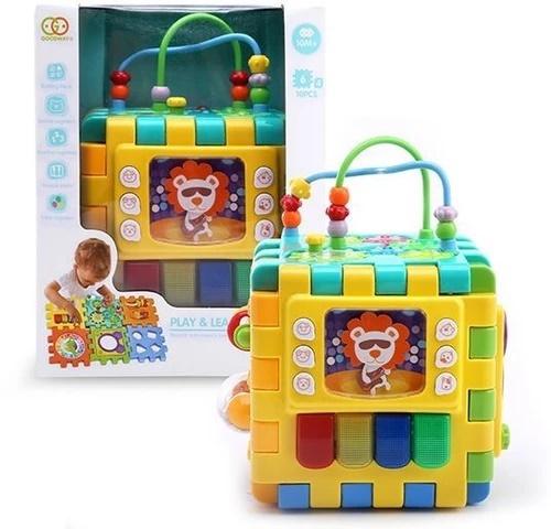 Kostka edukacyjna Funkcje: dźwięki, światło, ruchome elementy, labirynt z koralikami, odgłosy zwierząt, możliwość rozłożenia kostki, bezpieczne lusterko, sorter, zegar, pianinko, melodie