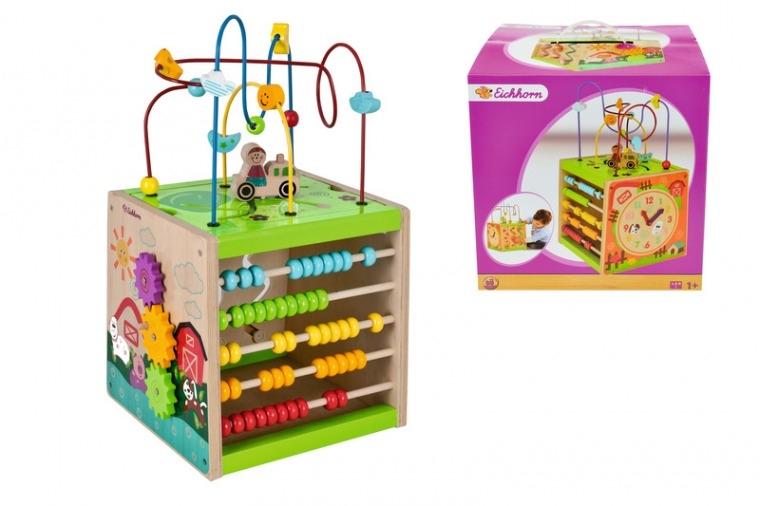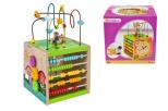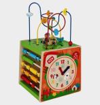Kostka edukacyjna do zabaw manualnych. Kostka zawiera zegar, koła obrotowe, liczydło. Ćwiczy zdolności motoryczne dziecka. Wiek od 12 miesięcy.
