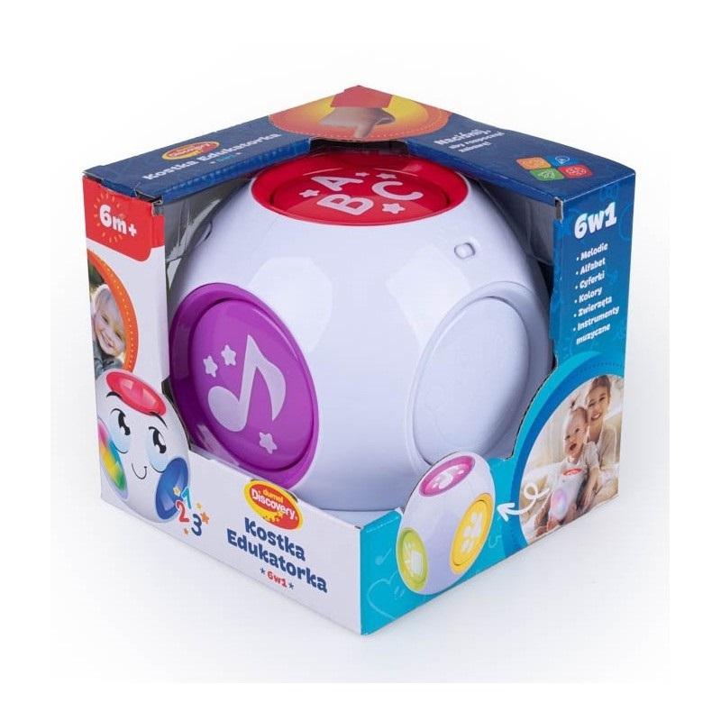Edukacyjna, dotykowa kostka pełna dźwięków i kolorów zabawi na 6 różnych sposobów! Kryje ona w sobie dźwięki instrumentów muzycznych, odgłosy zwierząt, słowa w języku polskim: nazwy kolorów, literek i cyferek oraz wesołe melodie. Poszczególne dźwięki uruchamia się poprzez dotykanie kolorowych ścianek, na których znajdują się symbole odpowiadające trybom zabawy. Kostka posiada regulację głośności i wyłącznik dźwięku.