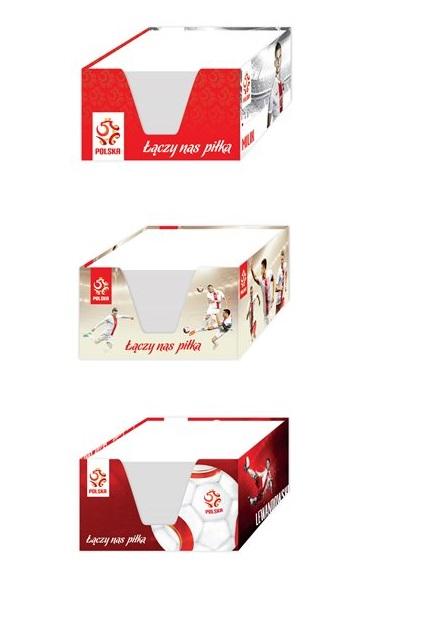 Kostka papierow abiała w kubiku kartonowym z wzorem PZPN.