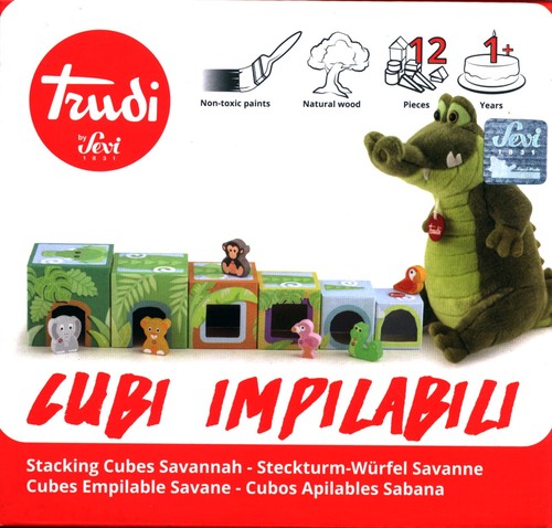 Zestaw drewnianych klocków progresywnych z wizerunkami zwierząt żyjących na sawannie. Dla dzieci od 1 roku życia