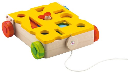 Zestaw składa się z drewnianego wózka - sortera, kolorowych klocków w różnych kształtach oraz figurki myszki. Dla dzieci od 1 roku życia.