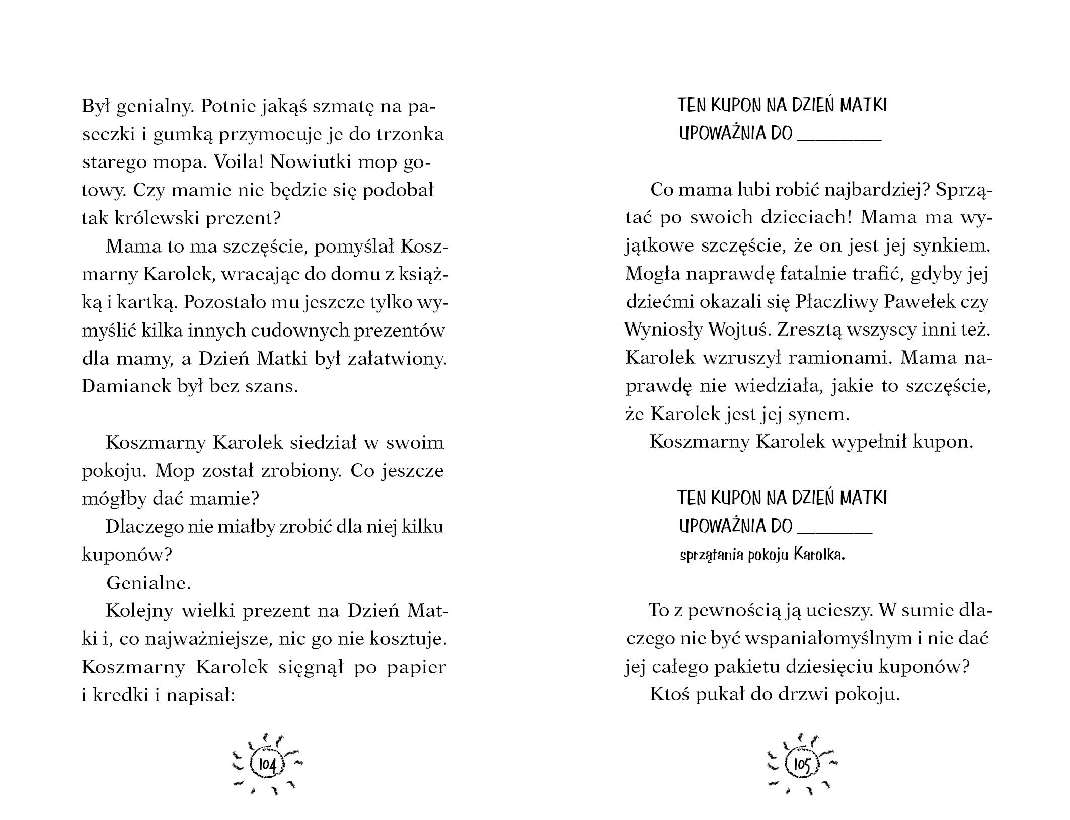 Najkoszmarniejszy bohater literatury dziecięcej powraca! Seria o Koszmarnym Karolku bawi od prawie trzydziestu lat, a jego postać i arcydożarte żarty są wciąż aktualne dla kolejnego pokolenia czytelników. Szalony humor, niegrzeczny bohater, krótkie i łatwe w lekturze opowiadania to jest to, co dzieci (dorośli też) lubią najbardziej.