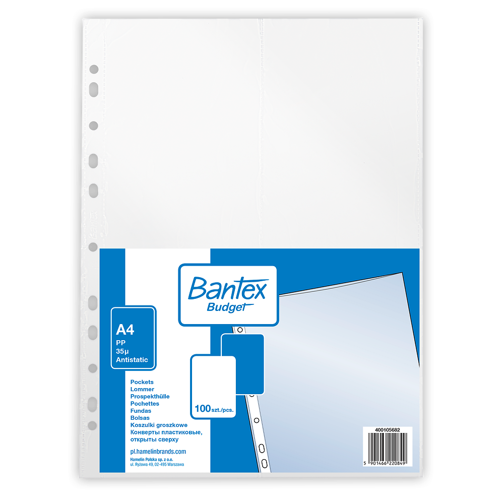 Groszkowe koszulki Budget w formacie A4, otwierane od góry. Przezroczysta, polipropylenowa folia jest antystatyczna i antyrefleksyjna, co ułatwia przechowywanie koszulek oraz zapewnia doskonałą czytelność dokumentów. 100 SZT. koszulek zapakowanych w folię, dzięki czemu zajmują niewiele miejsca.
