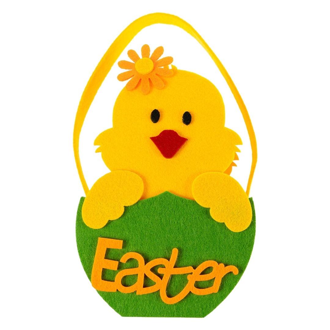 Duży kolorowy koszyczek wielkanocny wykonany z miękkiego filcu to wesoły element świątecznego wystroju. Został ozdobiony motywem żółtego kurczaczka wyglądającego z zielonej skorupki, na której znajduje się napis "Easter". Uroku całości dodaje filcowy kwiatek zdobiący główkę kurczaczka. Intensywne, wiosenne barwy - żółć, zieleń i pomarańcz - przyciągają wzrok i dodają radości każdemu wnętrzu