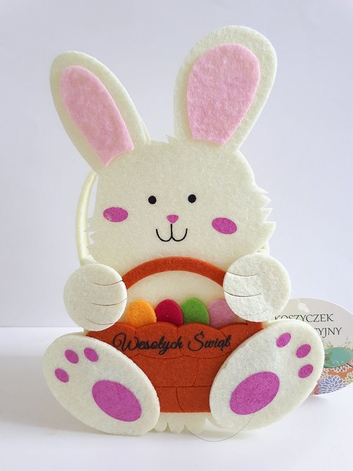 Koszyczek wykonany z filcu, który idealnie pasuje do przygotowania wielkanocnej dekoracji lub święconki dla dzieci. Wymiary koszyczka (z uchwytem): 22cm x 13cm x 8,5cm