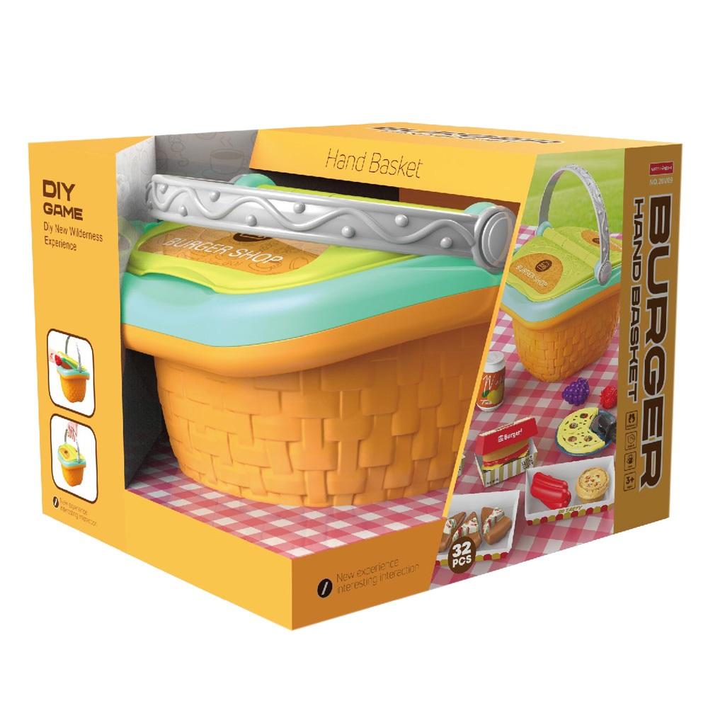 Koszyk piknikowy z akcesoriami. W zestawie kosz, plastikowe owoce, warzywa, mięso, pizza, burgery, buteleczki z przyprawami, naklejki. Łącznie 32 elementy.
