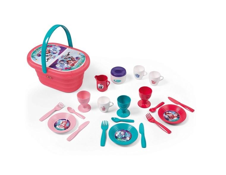 Plastikowy zamykany koszyk zawierający 22 akcesoria, w tym min. kubeczki, sztućce, szklaneczki, mlecznik.