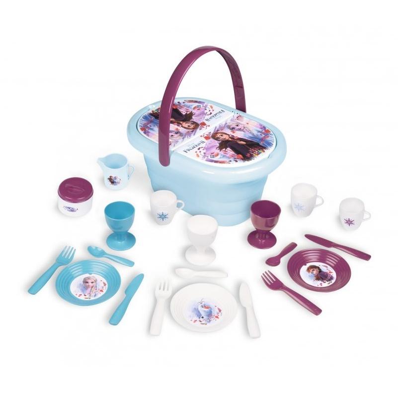 Kraina Lodu 2 - Koszyk piknikowy z akcesoriami 310511. Śliczny, plastikowy koszyk w błękitnym kolorze z fioletowym uchwytem. Kosz ozdobiono motywem postaci z bajki ""Kraina Lodu 2"". Zestaw kryje w sobie aż 21 elementów do wspaniałej zabawy. Dzieci znajdą w koszyku: 3 kielichy, 3 kubeczki, 3 tłoczone talerzyki z wizerunkiem postaci z bajki, sztućce dla 3 osób: łyżeczki, widelce i noże, mlecznik oraz cukiernicę.