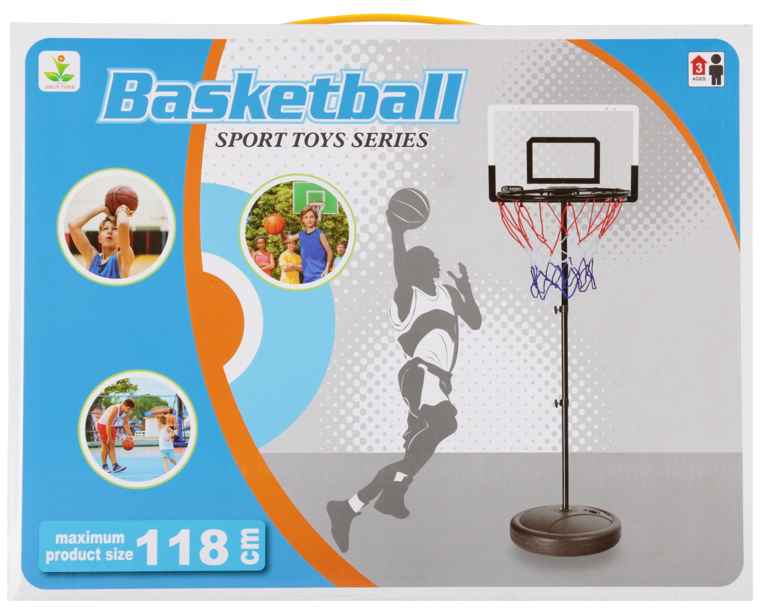 Wymiary tablicy (szer. x wys.)(cm: 40x26, Kosz razem ze stojakiem: minimalna wysokość 60 cm, maksymalna wysokość 118 cm, podstawka stojaka (szer. x wys. x gł.) (cm) 28x7x28. Zabawka wykonana z plastiku oraz materiału i gumy.