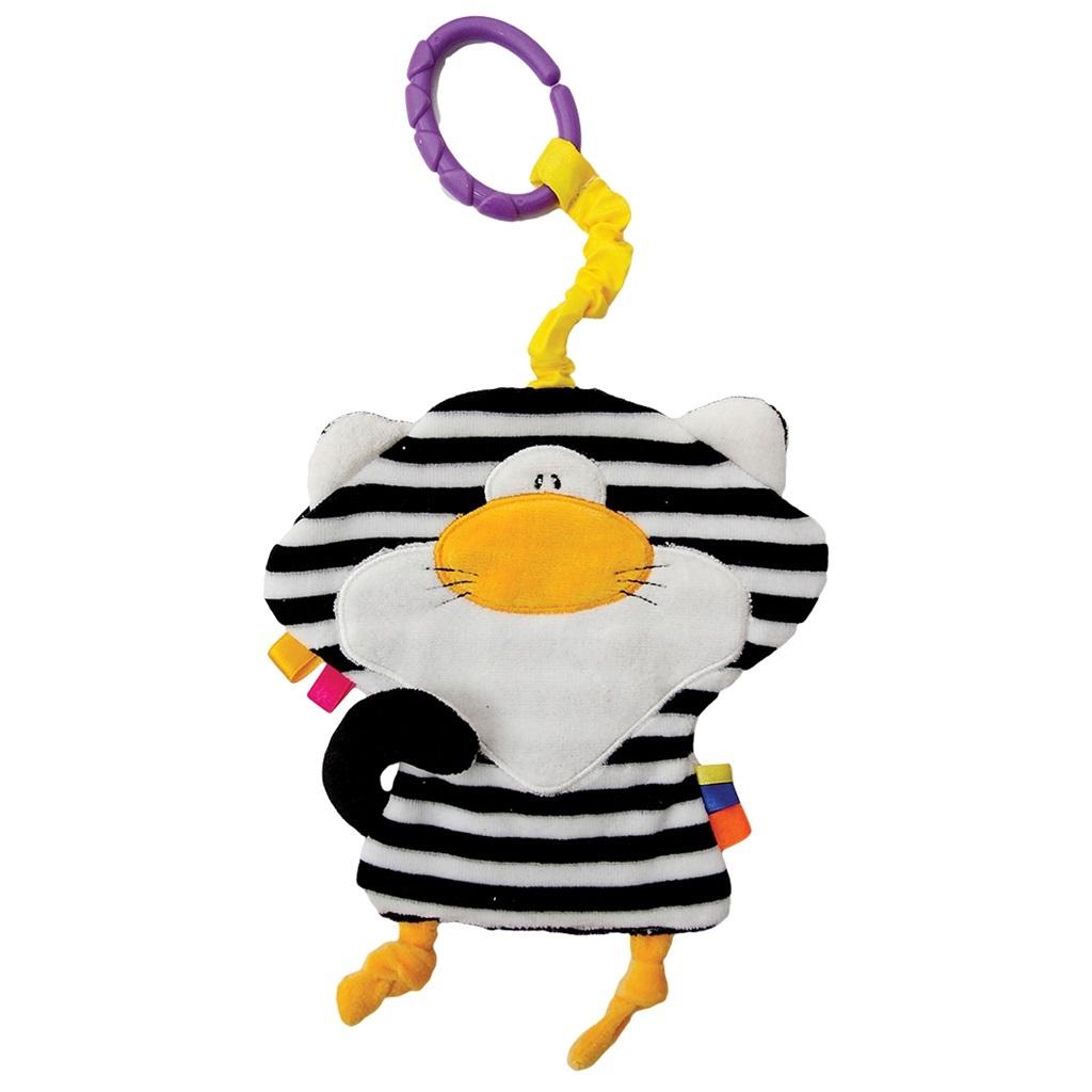 Szeleścik wypełniony jest szeleszczącą folią, której delikatny dźwięk przykuwa uwagę najmłodszych, dostarczając bodźców słuchowych. Delikatny szelest uspokaja maluszka, ponieważ kojarzy mu się z dźwiękami, które słyszał będąc w brzuszku mamy. Kolorowe metki i nóżki-supełki stymulują prawidłowy rozwój nauki chwytania, motoryki małej i koordynacji ręka-oko. Wyhaftowana buzia Kota Pasiaka wywoła uśmiech na twarzy Twojego maluszka. Szeleścik jest lekki i łatwo się go trzyma dlatego może towarzyszyć dziecku już od pierwszych chwil, zarówno w łóżeczku, jak i na spacerze. Dzięki przywieszce Kot Pasiak może podróżować z Twoim dzieckiem, przypięty do wózka, fotelika samochodowego lub torby. Równie dobrze możesz powiesić go przy łóżeczku, by był zawsze blisko Twojego maluszka.