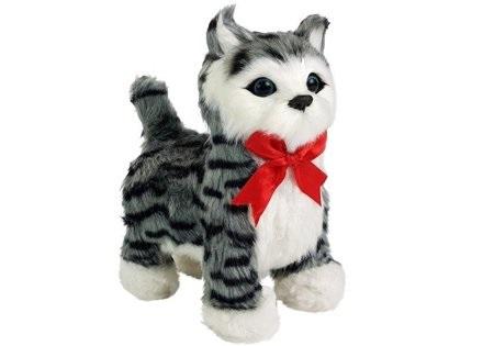 Interaktywny Kot Porusza się, Miauczy Jeśli Twoje dziecko marzy o własnym kotku - opiece nad nim, głaskaniu, przytulaniu zwierzątka i chce mieć swojego przyjaciela to interaktywny kotek to świetny kompan zabaw! Pomożemy spełnić marzenie. Uruchamia się przy dotknięciu, głaskaniu zaczyna miauczeć, poruszać główką i ogonkiem. Z każdym kontaktem kotek będzie reagował. Twój maluch poczuje, jakby miał prawdziwe zwierzątko. Natomiast po naciśnięciu z boku na brzuchu kotek porusza łapkami, idzie do przodu, a w tle gra wesoła muzyka! Zabawka nie tylko wywoła uśmiech na jego twarzy, ale i wesoło spędzi wolny czas. Będzie to początek do posiadania własnego zwierzęcia i nauki odpowiedzialności za zwierzę poprzez zabawę oraz sumienności w wykonywaniu obowiązków. Zaprocentuje to w przyszłości. A kto wie, może dzięki temu, jak maluch będzie opiekował się małym kotkiem, zasłuży na prawdziwego. Kot ma umaszczenie szary w czarne paski z elementami białego na łapkach, brzuchu i pyszczku. Kolor oczu ciemny z otoczką niebieskiego, wokół oczu czarna sierść sprawia, że zwierzątko przyciąga wzrok. Odwzorowuje prawdziwego kota, dodatkowo jest bardzo miły w dotyku. Piękna czerwona kokarda na szyi dodaje mu uroku. Wymiary kotka: 19 cm x 10 cm x 20 cm Zabawkowy piesek zapakowany jest w przezroczystą folię. Przeznaczony jest dla wszystkich dzieci, które ukończyły 3. rok życia. Piesek posiada certyfikat CE, co jest potwierdzeniem, że spełnia wymagania dyrektyw Unii Europejskiej. Zgodny z normą EN71. Jest to bardzo bezpieczna zabawka, pozbawiona ostrych elementów, przyjemna w dotyku. Do zabawy z kotkiem potrzebujecie 3 sztuk baterii 1,5V "AA". Wejście na baterie znajduje się pod spodem, pod futerkiem.
