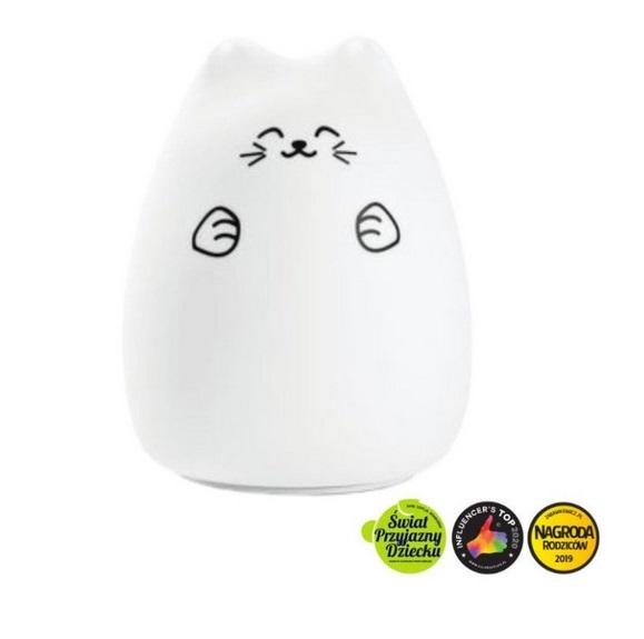 Lampka KOT SZCZĘŚCIARZ to charakterystyczna i zabawna lampka nocna w kształcie kota ze stojącymi, zaokrąglonymi uszkami, zadowoloną buźką i łapkami ułożonymi na brzuszku. Lampka sprawdza się świetnie jako towarzysz wieczornych zabawach wywołując uśmiech na twarzy dziecka. Umożliwia czytanie bajek przed snem jednocześnie zapewniając kojące towarzystwo i spokojny, bezpieczny sen. W godzinach nocnych ułatwia doglądanie najmłodszych pociech, zmianę pieluch i karmienie piersią. Nieco starszych dzieciom posłuży jako przenośne oświetlenie w drodze przez ciemny korytarz do łazienki lub sypialni rodziców. Lampka spełnia się jako doskonały przyjaciel w podróży dzięki ładowaniu za pomocą kabla micro USB. Lampka jest miękka i przyjemna w dotyku. Po ściśnięciu, lampka zmienia kształt, by po kilku chwilach wrócić do pierwotnego kształtu. Paleta kolorów lampki stworzy w pomieszczeniu niepowtarzalny, harmonijny, wypełniony miękkim światłem ciepły klimat. Lampka działa na poklepywanie. Dodatkową funkcją jest możliwość ustawienia automatycznego wyłączenia lampki po 2 godzinach. Obsługa lampki jest intuicyjna - nawet małe dziecko poradzi sobie bez problemu. Lampka Rabbit & Friends nie ma ostrych krawędzi ani się nie nagrzewa (dzięki technologii LED). Wykonana jest z wysokiej jakości, certyfikowanego, bezpiecznego, wolnego od BPA, silikonu. Lampka została doceniona i otrzymała kilka nagród: XVIII edycji konkursu Świat Przyjazny Dziecku organizowanej przez Komitet Ochrony Praw Dziecka, III edycji plebiscytu Influencers Top 2020 oraz prestiżowego konkursu Zabawka Roku, Nagroda Rodziców 2019 portalu zabawkowicz pl. Cechy:
