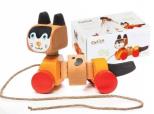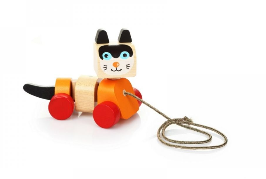 Drewniana zabawka Walk-A-Long Cat przeznaczona jest dla dzieci od 18 miesiąca życia. Zabawka składa się z kilku sekcji połączonych sznurkiem. Podczas ruchu zabawka zabawnie się porusza i przypomina ruch kociego ogona. Dziecko może go przekręcić, poprawiając w ten sposób swoje umiejętności motoryczne. Przed zabawką znajduje się lina. To świetna opcja zarówno do zabaw domowych, jak i zabaw na świeżym powietrzu.