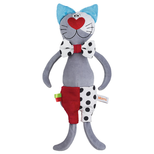 Kotek Kropek ma długie ręce i nogi, maluch będzie mógł swobodnie za  nie chwytać, ćwicząc swoje dłonie. Dodatkowo w głowie Kotka Kropka  umieściliśmy grzechotkę a w jego spodniach szeleszczącą folię. Delikatne dźwięki rozwijają zmysł słuchu malucha i zachęcają do dalszej zabawy.