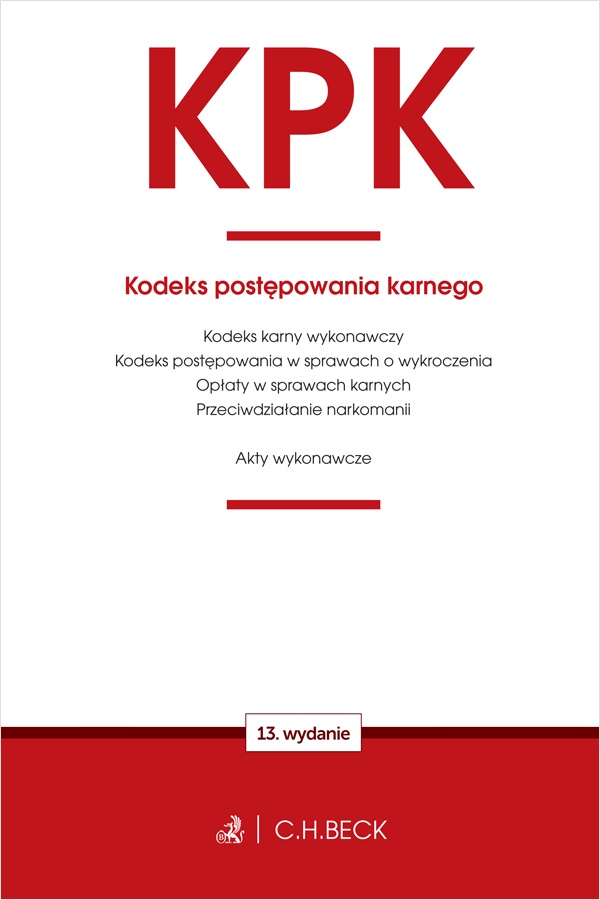 Stan prawny: 1 stycznia 2025 r. Zbiór uwzględnia zmiany wchodzące w życie: Kodeks postępowania karnego: 15.2.2024 r. – Ustawa o zmianie ustawy – Kodeks postępowania cywilnego oraz niektórych innych ustaw z dnia 13 stycznia 2023 r. (Dz.U. z 2023 r. poz. 289), 15.2.2024 r. – Ustawa o zmianie ustawy – Kodeks postępowania karnego oraz niektórych innych ustaw z dnia 14 kwietnia 2023 r. (Dz.U. z 2023 r. poz. 818), 15.2.2024 r. – Ustawa o zmianie ustawy – Kodeks rodzinny i opiekuńczy oraz niektórych innych ustaw z dnia 28 lipca 2023 r. (Dz.U. z 2023 r. poz. 1606), 14.3.2024 r. – Ustawa o zmianie ustawy – Kodeks karny oraz niektórych innych ustaw z dnia 7 lipca 2022 r. (Dz.U. z 2022 r. poz. 2600), 14.3.2024 r. – Ustawa o zmianie ustawy – Kodeks postępowania cywilnego, ustawy – Prawo o ustroju sądów powszechnych, ustawy – Kodeks postępowania karnego oraz niektórych innych ustaw z dnia 7 lipca 2023 r. (Dz.U. z 2023 r. poz. 1860), 31.8.2024 r. – Ustawa o zmianie niektórych ustaw w celu usprawnienia działań Sił Zbrojnych Rzeczypospolitej Polskiej, Policji oraz Straży Granicznej na wypadek zagrożenia bezpieczeństwa państwa z dnia 26 lipca 2024 r. (Dz.U. z 2024 r. poz. 1248), 10.11.2024 r. – Przepisy wprowadzające ustawę – Prawo komunikacji elektronicznej z dnia 12 lipca 2024 r. (Dz.U. z 2024 r. poz. 1222), 1.10.2028 r. – Ustawa o doręczeniach elektronicznych z dnia 18 listopada 2020 r. (Dz.U. z 2020 r. poz. 2320 ze zm.), 1.10.2029 r. – Ustawa o doręczeniach elektronicznych z dnia 18 listopada 2020 r. (Dz.U. z 2020 r. poz. 2320 ze zm.). Rozporządzenie Ministra Sprawiedliwości w sprawie szczegółowych zasad i trybu doręczania pism organów procesowych w postępowaniu karnym: Nowy tekst jednolity z dnia 16 września 2024 r. (Dz.U. z 2024 r. poz. 1463). Nowe Rozporządzenie Ministra Sprawiedliwości w sprawie sposobu przygotowania i przeprowadzenia przesłuchań w trybie określonym w art. 185a–185c oraz art. 185e Kodeksu postępowania karnego oraz warunków, jakim powinny odpowiadać pomieszczenia przeznaczone do przeprowadzania takich przesłuchań z dnia 22 września 2024 r. (Dz.U. z 2024 r. poz. 1477) Kodeks karny wykonawczy: Nowy tekst jednolity z dnia 21 marca 2024 r. (Dz.U. z 2024 r. poz. 706), 1.1.2025 r. – Ustawa o ochronie ludności i obronie cywilnej z dnia 5 grudnia 2024 r. (Dz.U. z 2024 r. poz. 1907), 1.1.2026 r. – Ustawa o zmianie ustawy – Kodeks karny oraz niektórych innych ustaw z dnia 7 lipca 2022 r. (Dz.U. z 2022 r. poz. 2600). Rozporządzenie Ministra Sprawiedliwości w sprawie sposobu i trybu wykonywania czynności przez kuratorów sądowych w sprawach karnych wykonawczych: Nowy tekst jednolity z dnia 23 września 2024 r. (Dz.U. z 2024 r. poz. 1455). Rozporządzenie Ministra Sprawiedliwości w sprawie sposobów prowadzenia oddziaływań penitencjarnych w zakładach karnych i aresztach śledczych: Nowy tekst jednolity z dnia 3 września 2024 r. (Dz.U. z 2024 r. poz. 1344). Kodeks postępowania w sprawach o wykroczenia: Nowy tekst jednolity z dnia 11 czerwca 2024 r. (Dz.U. z 2024 r. poz. 977), 1.11.2024 r. – Ustawa o zmianie ustawy o delegowaniu kierowców w transporcie drogowym oraz niektórych innych ustaw z dnia 25 września 2024 r. (Dz.U. z 2024 r. poz. 1544), 1.10.2029 r. – Ustawa o doręczeniach elektronicznych z dnia 18 listopada 2020 r. (Dz.U. z 2020 r. poz. 2320 ze zm.). Książka zawiera: Tekst ustawy Kodeks postępowania karnego i przepisy wprowadzające, Tekst ustawy Kodeks karny wykonawczy, Tekst ustawy Kodeks postępowania w sprawach o wykroczenia, Ustawę o przeciwdziałaniu narkomanii, Ustawę o opłatach w sprawach karnych, Rozporządzenia, Indeks rzeczowy. Książka adresowana jest do prawników oraz studentów prawa, dla których znajomość obowiązujących przepisów stanowi warunek prawidłowego wykonywania zawodu. Kolejne wydania publikacji uwzględniają najnowsze zmiany, przez co zapewniają bieżącą znajomość prawa.