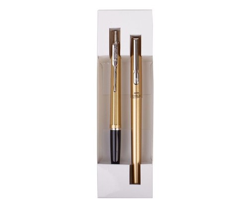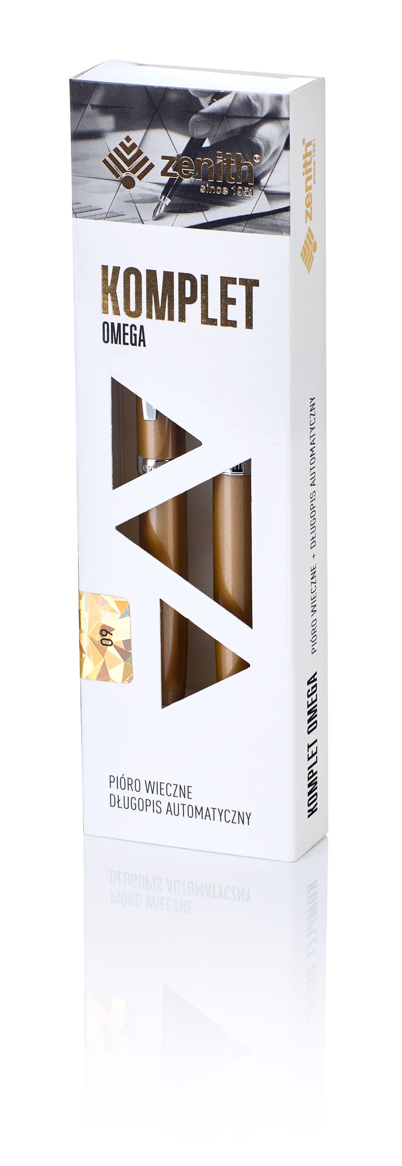 Pióro wieczne Zenith Omega Metallic oraz długopis automatyczny Zenith 7. Klips, stalówka oraz obrączka korpusu pokryte wysokiej jakości powłoką niklową. Stalówka zakończona irydową kulką dla zapewnienia doskonałej jakości i łatwości pisania. Wymienne naboje atramentowe. Korpus długopisu wykonany z błyszczącego tworzywa sztucznego. Obudowa dzielona w 1/3 wysokości (górna część ośmiokątna) obie części korpusu oddzielone mosiężno-niklowaną obrączką. Wymienny wkład wielkopojemny Zenith 4 z dokumentalnym tuszem w kolorze niebieskim gwarantującym trwałość zapisu. Długość linii pisania 4500 metrów.
