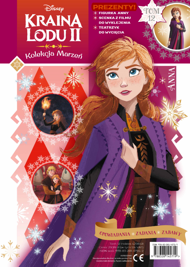 W każdym tomie Kolekcji Marzeń znajdziesz prześliczną ręcznie malowaną figurkę, kolejną część filmowej historii , a także nieznane przygody Anny, Elsy i ich przyjaciół. Do tego czeka Cię mnóstwo zabawy – wycinanki, naklejki, zadania, ciekawostki oraz scenki do wyklejania, dzięki którym zwiedzisz wspaniałe komnaty zamku Arendelle! Kolekcja składa się z 20 tomów, nowy tom w sprzedaży co 2 tygodnie
