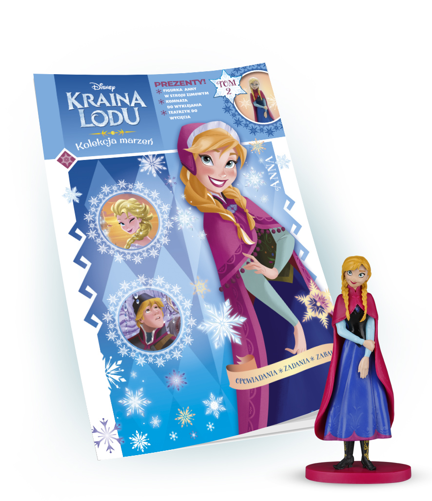 W każdym tomie Kolekcji Marzeń znajdziesz prześliczną ręcznie malowaną figurkę, kolejną część filmowej historii , a także nieznane przygody Anny, Elsy i ich przyjaciół. Do tego czeka Cię mnóstwo zabawy – wycinanki, naklejki, zadania, ciekawostki oraz scenki do wyklejania, dzięki którym zwiedzisz wspaniałe komnaty zamku Arendelle! Kolekcja składa się z 20 tomów, nowy tom w sprzedaży co 2 tygodnie