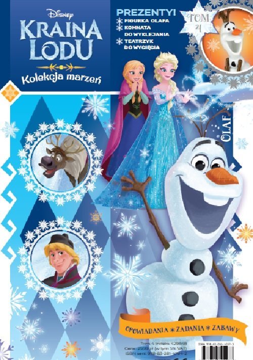 W każdym tomie Kolekcji Marzeń znajdziesz prześliczną ręcznie malowaną figurkę, kolejną część filmowej historii , a także nieznane przygody Anny, Elsy i ich przyjaciół. Do tego czeka Cię mnóstwo zabawy – wycinanki, naklejki, zadania, ciekawostki oraz scenki do wyklejania, dzięki którym zwiedzisz wspaniałe komnaty zamku Arendelle! Kolekcja składa się z 20 tomów, nowy tom w sprzedaży co 2 tygodnie