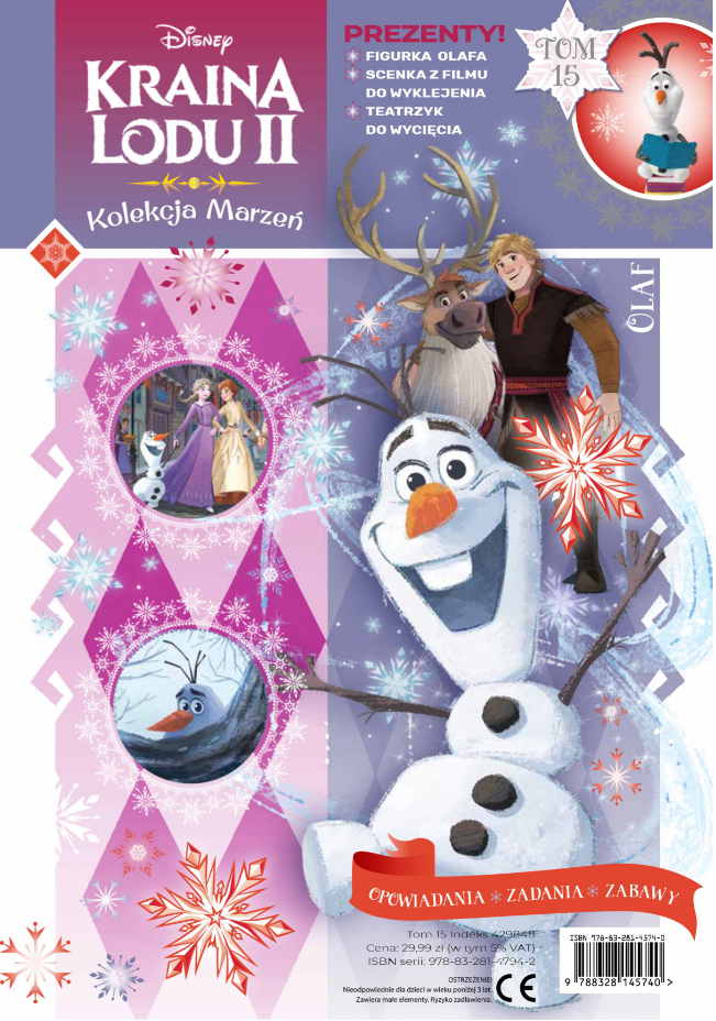 W każdym tomie Kolekcji Marzeń znajdziesz prześliczną ręcznie malowaną figurkę, kolejną część filmowej historii , a także nieznane przygody Anny, Elsy i ich przyjaciół. Do tego czeka Cię mnóstwo zabawy – wycinanki, naklejki, zadania, ciekawostki oraz scenki do wyklejania, dzięki którym zwiedzisz wspaniałe komnaty zamku Arendelle! Kolekcja składa się z 20 tomów, nowy tom w sprzedaży co 2 tygodnie