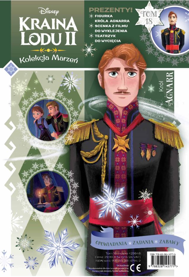 W każdym tomie Kolekcji Marzeń znajdziesz prześliczną ręcznie malowaną figurkę, kolejną część filmowej historii , a także nieznane przygody Anny, Elsy i ich przyjaciół. Do tego czeka Cię mnóstwo zabawy – wycinanki, naklejki, zadania, ciekawostki oraz scenki do wyklejania, dzięki którym zwiedzisz wspaniałe komnaty zamku Arendelle! Kolekcja składa się z 20 tomów, nowy tom w sprzedaży co 2 tygodnie