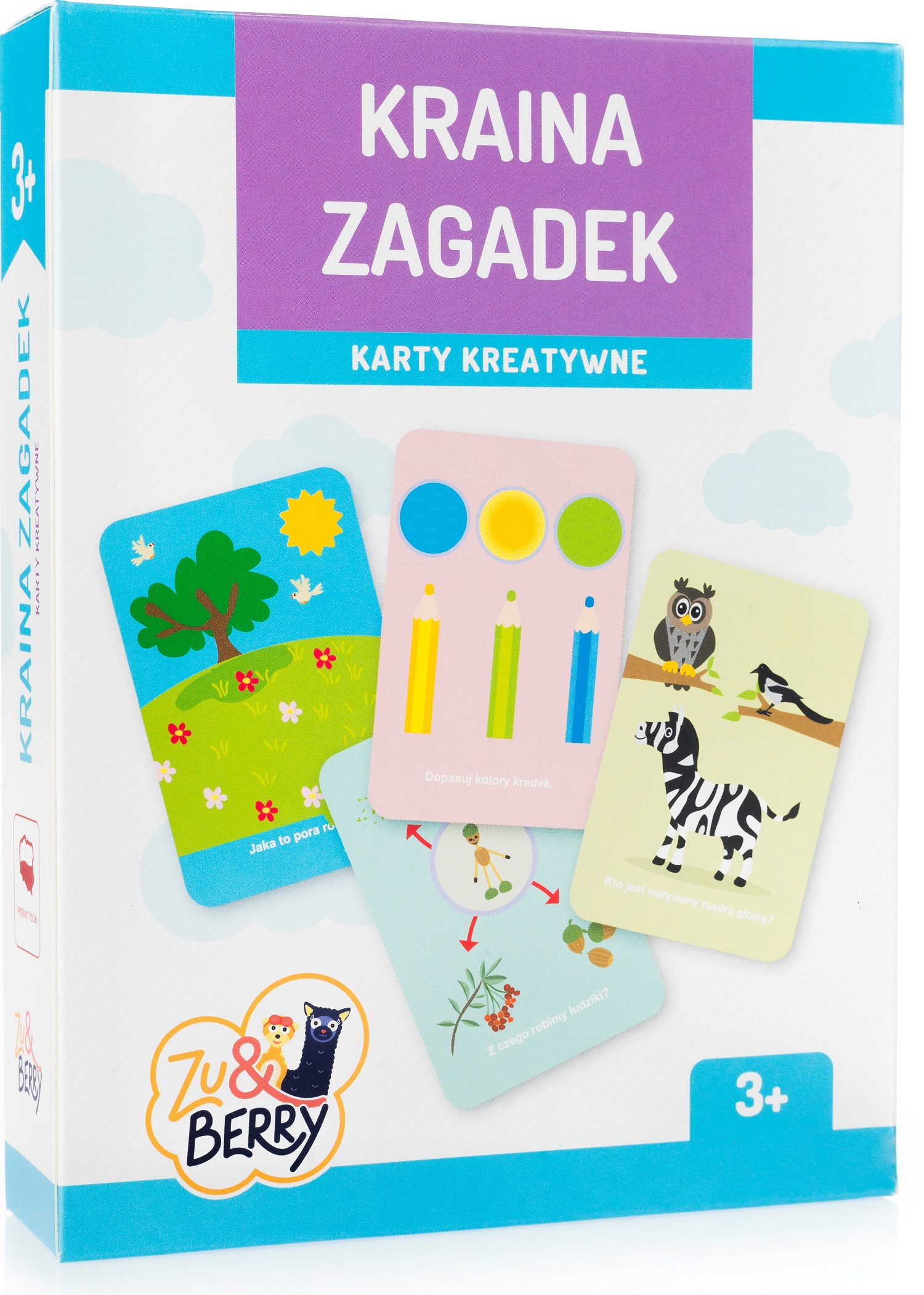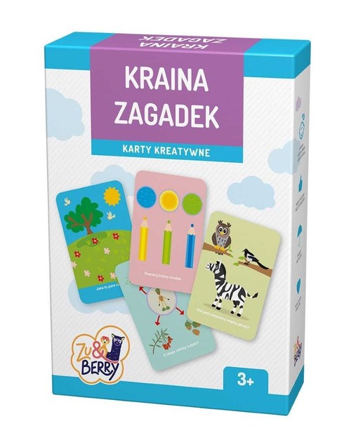 KARTY DLA MAŁYCH ODKRYWCÓW. Kraina zagadek to 80 dwustronnych kart, które w sposób naturalny pozwalają dziecku rozszerzyć wiedze o otaczającym go świecie. Zagadki wzbogacają dziecięcy słownik, a także rozwijają inteligencje, myślenie przyczynowo skutkowe oraz kreatywność. Karty Kraina zagadek są polecane do zabawy dziecka z rodzicem od 3 roku życia oraz rekomendowane do pracy z dziećmi: psychologom, pedagogom, terapeutom i logopedom. Dzięki nim dziecko w łatwy i bardzo naturalny sposób nabywa wiedzę o świecie i rozwija swoją inteligencję. Rozwiązywanie łamigłówek zawartych na kartach rozwija: myślenie przyczynowo - skutkowe (np. dopasowanie krowa – mleko, kura – jajko), myślenie dedukcyjne (Co powinniśmy spakować na basen?), kreatywność (Co kryje się za drzewami?), wzbogaca dziecięcy słownik językowy rzadko używanymi na co dzień pojęciami (Które morze jest wzburzone?), pozytywnie wpływa na kształtowanie się percepcji wzrokowej (Który obrazek jest lustrzanym odbiciem?).