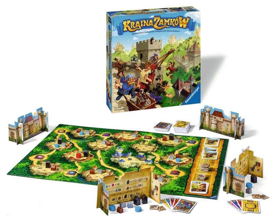Zgarniaj karty i buduj grody! Zdobądź tytuł Mistrza Budowy! Budowlana gorączka w krainie zamków: wszędzie powstają domy, mury, wieże. Śpieszcie się więc, inaczej najlepsze place budowy zostaną zajęte, zanim zdążycie zamieszaź zaprawę. Zbierzcie jak najwięcej pasujących kart do budowania, wznieście grody jak najszybciej i zostańcie Mistrzem Budowy. Zawartość: plansza do gry 4 skłądane zasłonki 97 kart do gry 49 drewnianych obiektów 12 kart budowy 11 kart ze studnią 8 kamieni granicznych 24 płytki instrukcja gry. Wiek 9-99 lat, liczba graczy 2-4.
