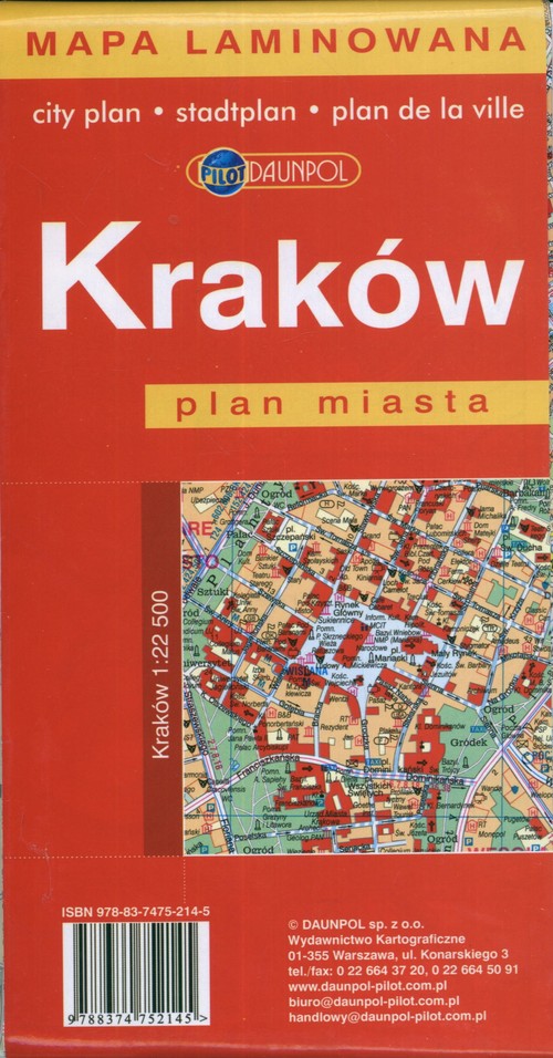Plan miasta Krakowa w skali 1:22 500. Trasy komunikacji miejskiej. Plan centrum 1:10 000. Turystyczna mapa okolic w skali 1:200 000.