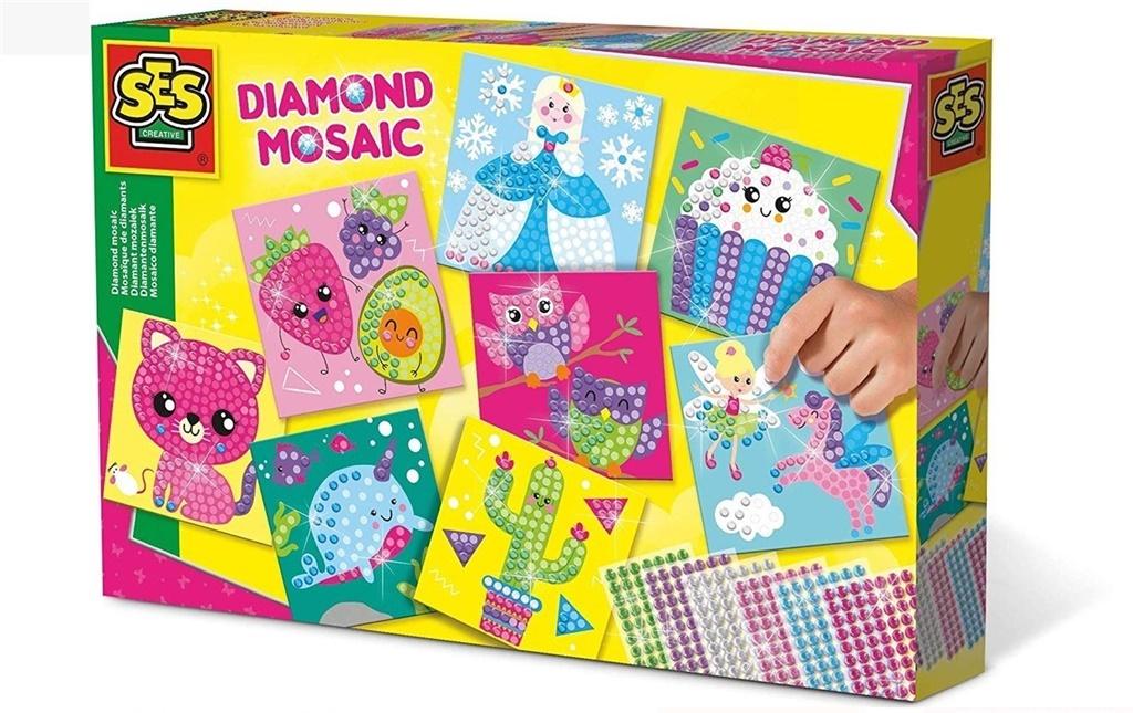 Zabaw się z mozaiką. Ozdób osiem różnychobrazków za pomocą kolorowych diamentowych koralików. Projektuj mozaiki według własnych pomysłów. Dla dzieci w wieku od 5 lat