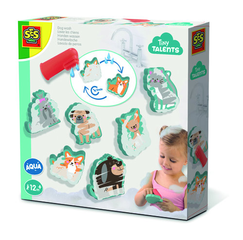 Te psy (i jeden kot) były trochę niegrzeczne i tarzały się w błocie. Trzeba było je wyprać i zniknęły całkowicie pod grubą warstwą piany! Czy zamierzasz je wyczarować ponownie? Stają się ponownie widoczne pod wpływem wody, gdy użyjesz dołączonej szczoteczki palcowej! Przyjemny w wannie lub pod prysznicem!