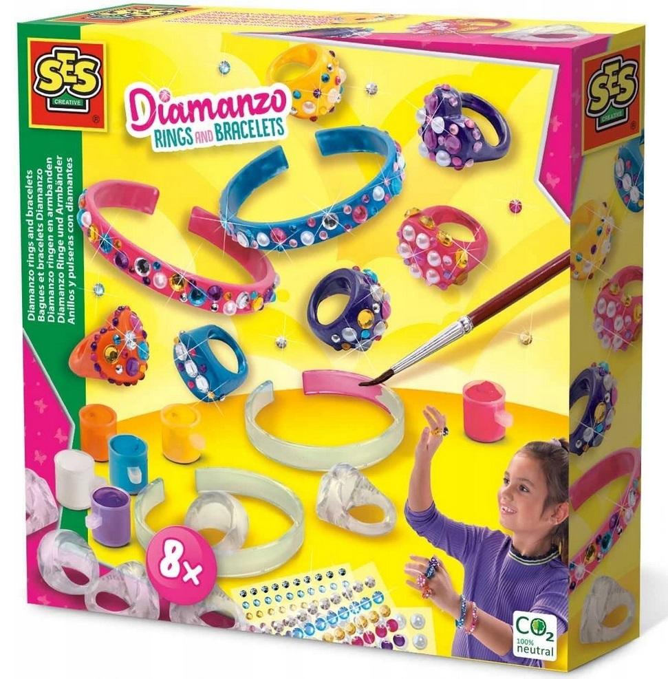 Udekoruj własne bransoletki i pierścionki. Stwórz dwie fantastyczne bransoletki i sześć modnych pierścionków. Pomaluj swój własny wzór na przezroczystych bransoletkach i pierścionkach. Dla dziewczynek kochających modę. Pobudza kreatywność.