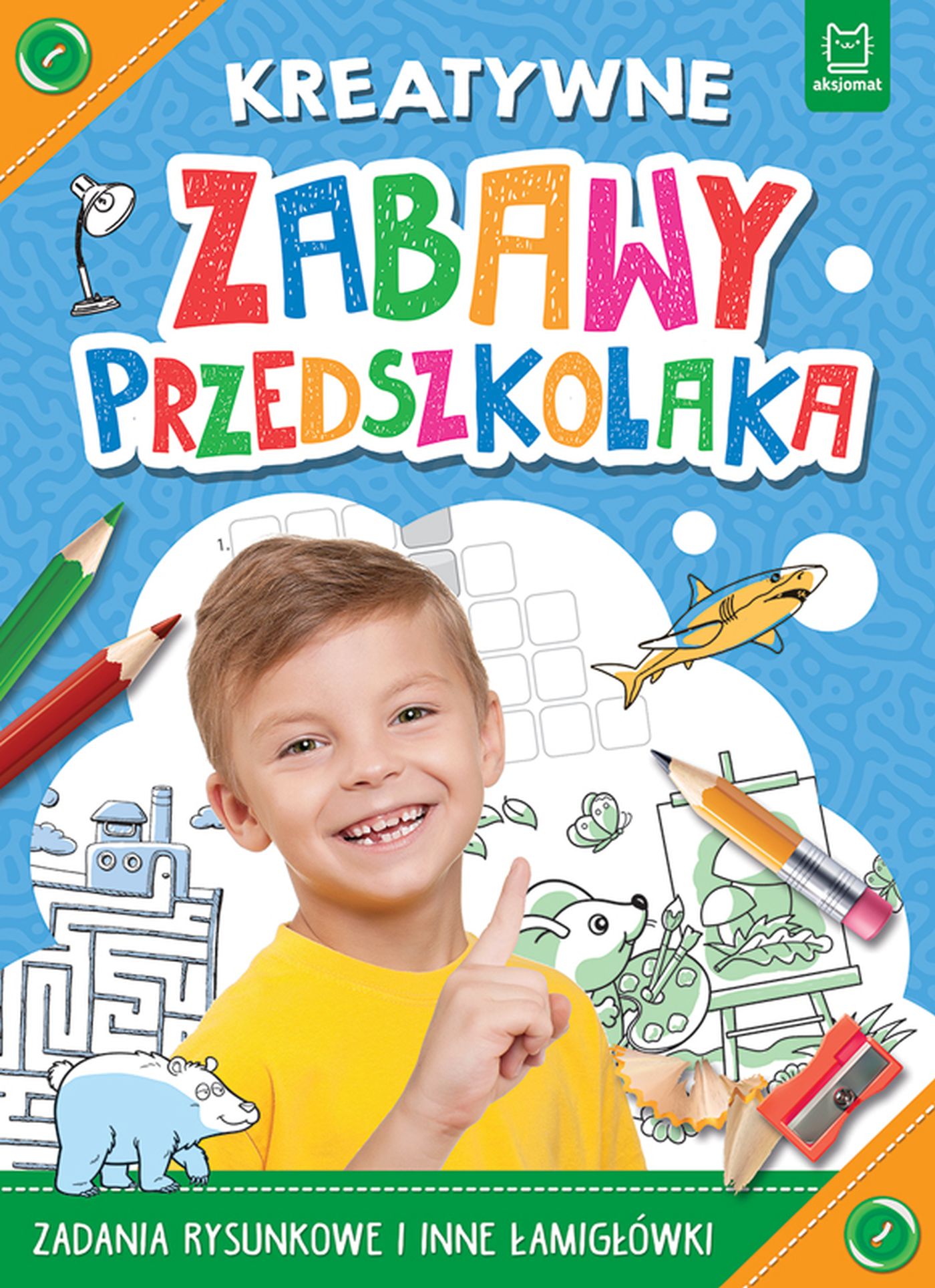 Kreatywne zabawy przedszkolaka Książeczka, w których nauka idzie w parze z zabawą. Dziecko znajdzie labirynty, krzyżówki, obrazki do porównania i niedokończone rysunki, które powstaną po połączeniu punktów. Zadania są przeznaczone dla przedszkolaków i dostosowane do ich możliwości. Rozwiązując je, dzieci dobrze się bawią, a jednocześnie ćwiczą wiele potrzebnych umiejętności: spostrzegawczość, staranność, cierpliwość, utrwalają znajomość cyfr i liter. Taka nauka to świetna zabawa!