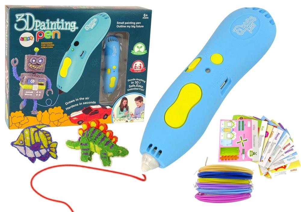 DŁUGOPIS DRUKARKA 3D PEN ZESTAW + WKŁADY SZABLONY INSTRUKCJA Kolor NIEBIESKI Doskonały do zabawy i nauki! Rozwija zdolności manualne, wyobraźnię oraz motorykę dziecka. Technologia druku 3D umożliwia tworzenie imponujących, trwałych kształtów, projektów oraz modeli, które możemy wykorzystać do ozdoby, zabawy, ale także nauki. Długopis 3D to urządzenie, które pozwoli rozpocząć przygodę z wykorzystaniem tego rodzaju rozwiązań. Obsługuje zarówno wkłady wykonane z ABS, jak również PLA. Oba materiały różnią się swoimi właściwościami, a pod względem estetycznym, umożliwiają osiągnięcie zróżnicowanego stopnia połysku tworzonych z użyciem pisaka 3D projektów. Pióro trójwymiarowe jest proste w użyciu, a do przystąpienia do pracy wystarczy podłączenie go do prądu. Długopis 3D, to urządzenie, za pomocą którego możemy stworzyć dowolne figury i obrazy, wszystko zależy od naszej wyobraźni. Długopis sprawi radość zarówno dzieciom jak i dorosłym. Jest to gadżet, którym za każdym razem wyczarujesz fantastyczne figury przestrzenne. Zachęca do kreatywnego tworzenia. Sposób działania: Aby rozpocząć pracę należy podłączyć długopis przy pomocy kabla do zasilania i nacisnąć przycisk uruchomienia. Gdy długopis będzie gotowy do pracy dioda LED umieszczona na urządzeniu zmieni kolor. Następnie wystarczy włożyć filament do długopisu w wyznaczony otwór i możemy rozpocząć tworzenie. Gdy chcemy zmienić kolor po prostu wyjmujemy wcześniej włożony filament i zastępujemy go wkładem w innym, wybranym przez nas kolorze. Urządzenie nie wymaga dostępu do komputera. Długopis 3D jest przyjazny dla użytkownika i łatwy w obsłudze. Dzięki jego wyprofilowanemu kształtowi i niewielkiej wadze idealnie leży w dłoni, dzięki czemu użytkownik nie odczuwa zmęczenia podczas pracy i zabawy. Długopis jest wygodny w trzymaniu. Różne kolory filamentów pozwalają na tworzenie ciekawych projektów, co zdecydowanie wpływa na możliwości rozwojowe osób, które rozpoczynają swoją przygodę z drukiem 3D. Filamenty wykonane z PLA (poliaktyd), który cechuje się dużą wytrzymałością i trwałością. Wymiary zabawki: 14 cm x 3 cm x 4 cm Wymiary opakowania: 30 cm x 25 cm x 8 cm Przeznaczona dla dzieci powyżej 3 roku życia. Zgodne z normą EN71 i certyfikatem CE.