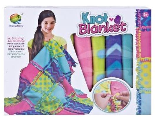 W zestawie: różnokolorowe kawałki kocyka 29 x 29 cm. w 6 kolorach, aby stworzyć koc należy spleść ze sobą poszczególne elementy