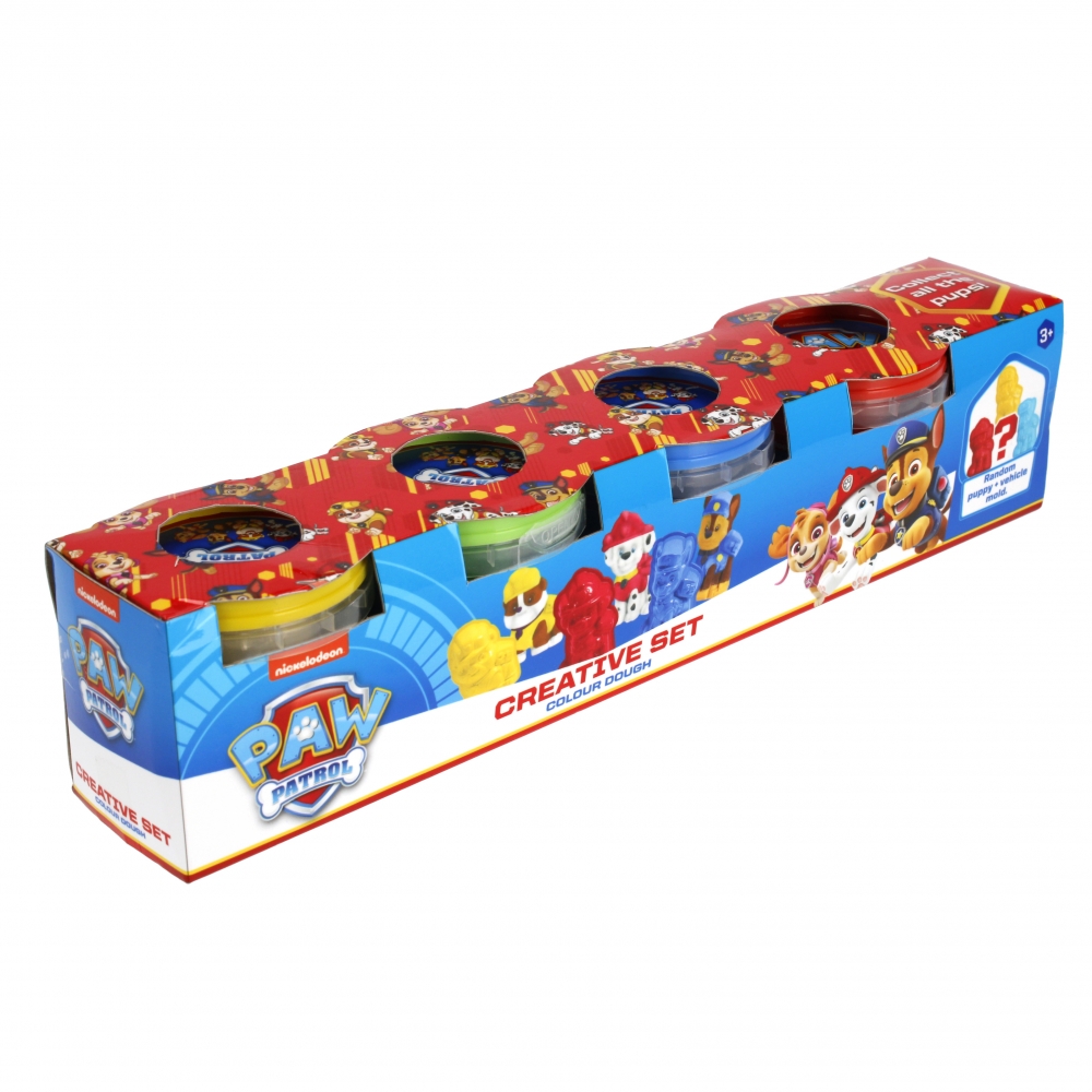 Kreatywny zestaw mas plastycznych Psi Patrol pozwala na realizację własnych pomysłów na wszystko, czego tylko dusza zapragnie. Łącząc poszczególne kolory, można przygotować fantazyjne rzeczy. To niekończące się pasmo niezwykłej przygody. Zestaw z czterema masami plastycznymi może służyć jako uzupełnienie zestawów z akcesoriami.