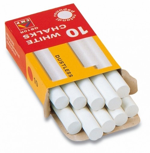 Biała kreda (siarczan wapnia) bezpyłowa. Pozostawia jednolitą cienką linię w praktyce na każdej powierzchni bez pylenia. Najlepiej służy do pisania na gładkich powierzchniach takich jak: szkło, metal, plastik. Może być również wykorzystywana do prac z pastelami na suchej powierzchni jak: papier, karton, tektura. Jedno opakowanie zawiera 10 laseczek o średnicy 9mm i długości 80mm. Produkt dla dzieci od 3 lat.