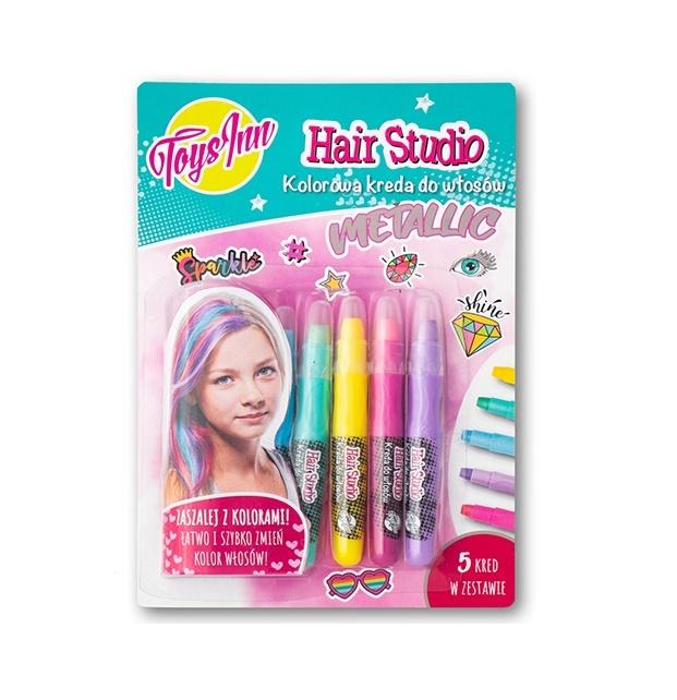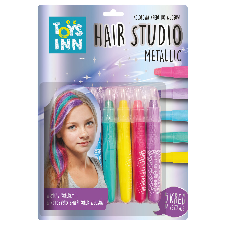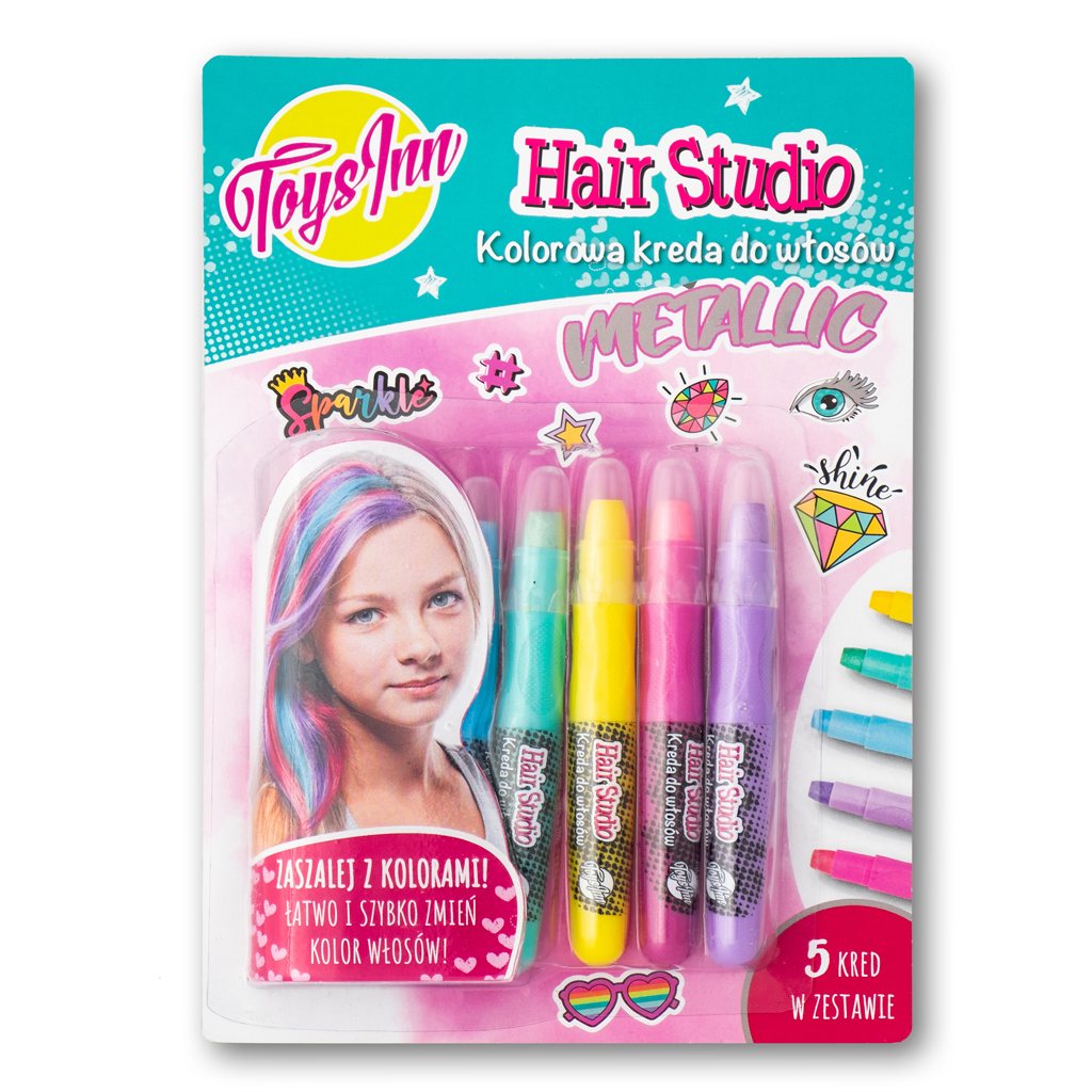 Hair studio Metallic - to kolorowa kreda do włosów o metalicznych odcieniach. Zaszalej z kolorami! Łatwo i szybko zmień kolor włosów. Zestaw zawiera pięć kred w kolorach: metaliczny niebieski, metaliczny zielony, metaliczny żółty, metaliczny różowy i metaliczny fioletowy. W celu usunięcia kolorów z włosów wystarczy umyć je szamponem.