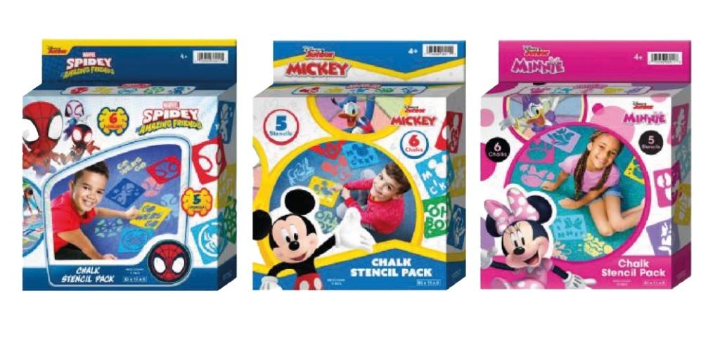 w zestawie 6 różnokolorowych kred i 5 szablonów, mix licencji Minnie, Spidey, Mickey, 12 sztuk w displayu, 4l+ cena za 1 szt, wysyłka losowo