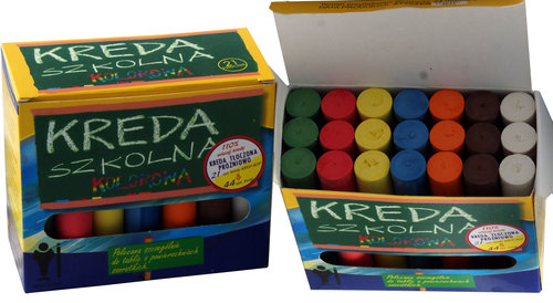 Kreda niepyląca okrągła tłoczona typu szampańskiego 21 szt. - 7 kolorów, dzięki specjalnej technologii tłoczenia próżniowego nie brudzi i nie pyli, nie kruszy się, do pisania po powierzchniach szorstkich. Widoczna również na mokrej powierzchni. Do produkcji wykorzystana naturalna kreda (nie gips). 3 razy wydajniejsza niż kreda odlewana. Kreda kolorowa posiada bardzo intensywne wybarwienie. Posiada znak CE potwierdzonymi aktualnymi badaniami zgodność z normami PN-EN 71-1+A3:2014 , PN-EN 71-2:2011, PN-EN 71-3:2013, PN-EN 71-9 2007. Posiada również certyfikat Stowarzyszenia Dzieci Chorych na Astmę i Alergię, Certyfikat bezpieczeństwa B, oraz pozytywną opinię Szpitala Chorób Gruźliczych. Posiada Atest PZH.