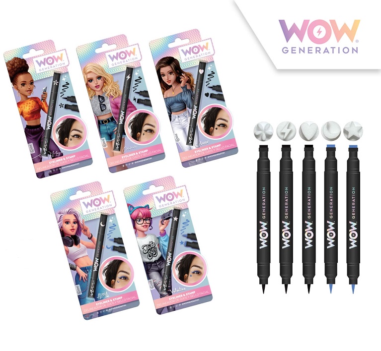 Kredka do oczu ze stemplami do ozdabiania twarzy - WOW Generationto wspaniała propozycja dla każdej małej dziewczynki.Eyliner i stempel są idealne do uzupełnienia prostego makijażu Twojej córki.Nie potrzeba wiele, aby się wyróżniać, dlatego eyliner ze stemplem jest idealny, aby Twoje dziecko wygladało jak jedna z dziewczyn WOW.Eyelinery są bardzo cienkie i z domieszką koloru, czarne lub niebieskie.Stemple dostępne są w kształatach błyskawica serce gwiazga