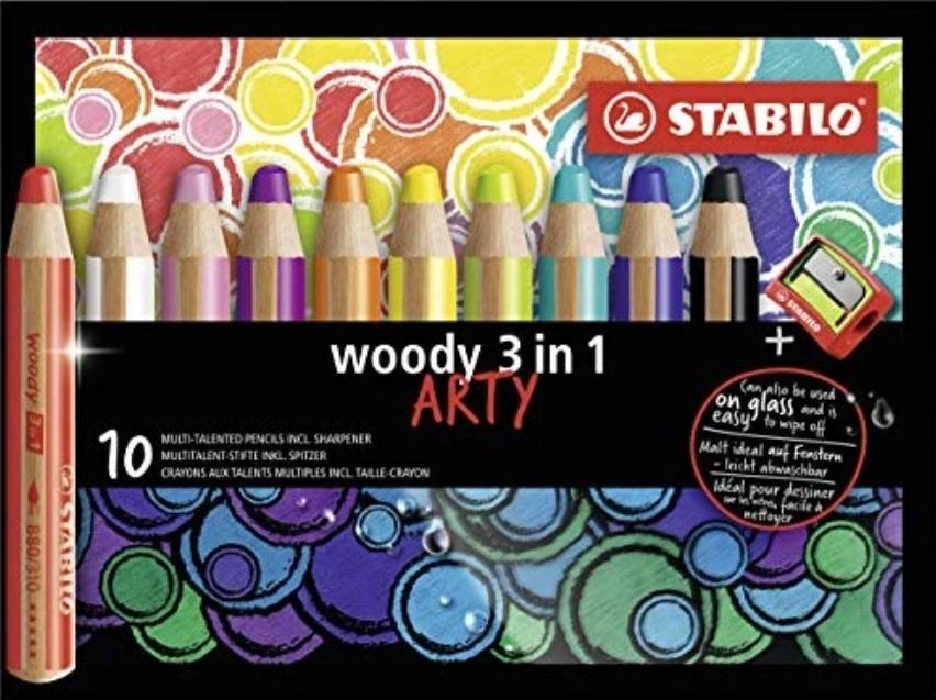 STABILO woody 3 in 1 - kredka, kredka akwarelowa i kredka woskowa. Rdzeń w rozmiarze XXL odpowiada aż 8 standardowym kredkom, dlatego starcza na bardzo długo. Duża średnica kredki jest idealna dla dziecięcych dłoni. Wyjątkowo miękki rdzeń sprawia, że można nimi rysować również po gładkich powierzchniach np. szkle. Miękki i bogaty w pigment rdzeń, sprawia, że malowana powierzchnia jest pokrywana z dużą łatwością, a kolor widać nawet na ciemnym tle. Posiadają certyfikat PEFC - do ich produkcji używane jest drewno z plantacji ekologicznej, posiadającej certyfikat PEFC. Kupując produkty drewniane oznaczone certyfikatem PEFC możemy mieć pewność, że pochodzą one z lasu zarządzanego zgodnie z dobrem przyrody a także dobrem żyjących w jego obrębie społeczności, czyli według Zasad Dobrej Praktyki Leśnej. Dostępne są w 18 kolorach. Idealne dla dzieci i nie tylko! Opakowania z motywem ARTY stworzone zostały tak, by być inspiracją dla osób, które lubią zajęcia plastyczne. Kartonowe etui zawierające 10 szt. z temperówką.