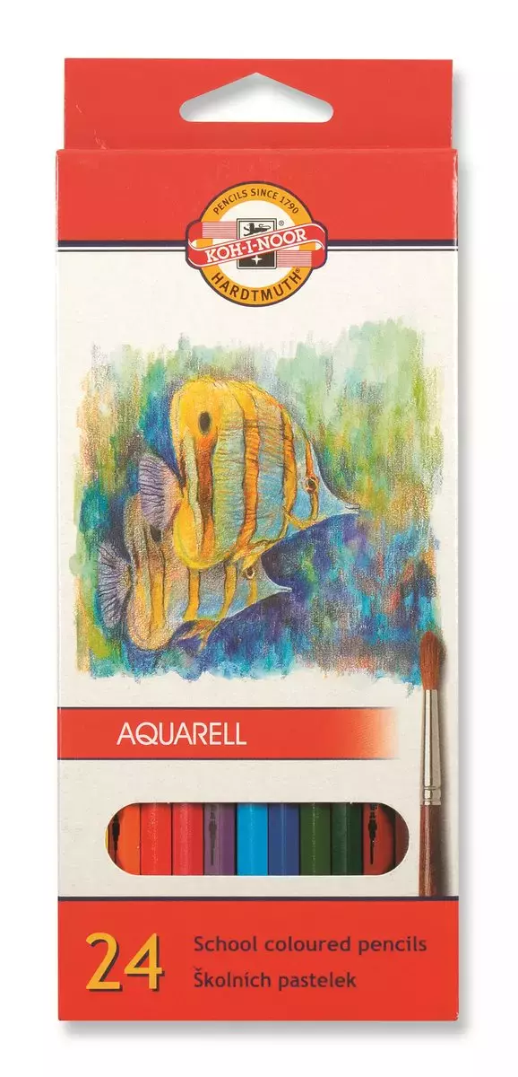 Zestaw 24 kredek akwarelowych w pudełku. Kredki służą do wykonywania klasycznych rysunków, a także do uzyskiwania efektu akwareli. Po naniesieniu pędzelkiem wody, rysunek można rozmywać uzyskując efekt obrazu namalowanego farbami akwarelowymi.
