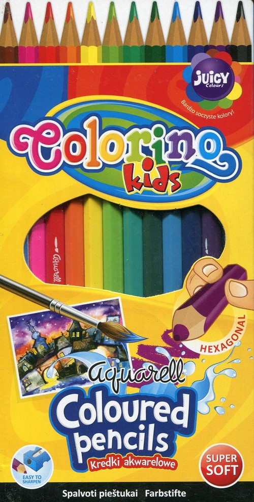 Kredki akwarelowe Colorino to wysokiej jakości wodorozpuszczalne kredki. Mogą być stosowane zarówno na suchym, jak i na mokrym papierze. Podwójne zastosowanie kredek pozwala uzyskać ciekawe efekty artystyczne. Kredek akwarelowych Colorino można używać tak samo, jak zwykłych kredek ołówkowych. Można też wykorzystać ich walory akwareli. Wystarczy za pomocą lekko zwilżonego pędzelka rozmyć pokolorowany wcześniej obrazek.