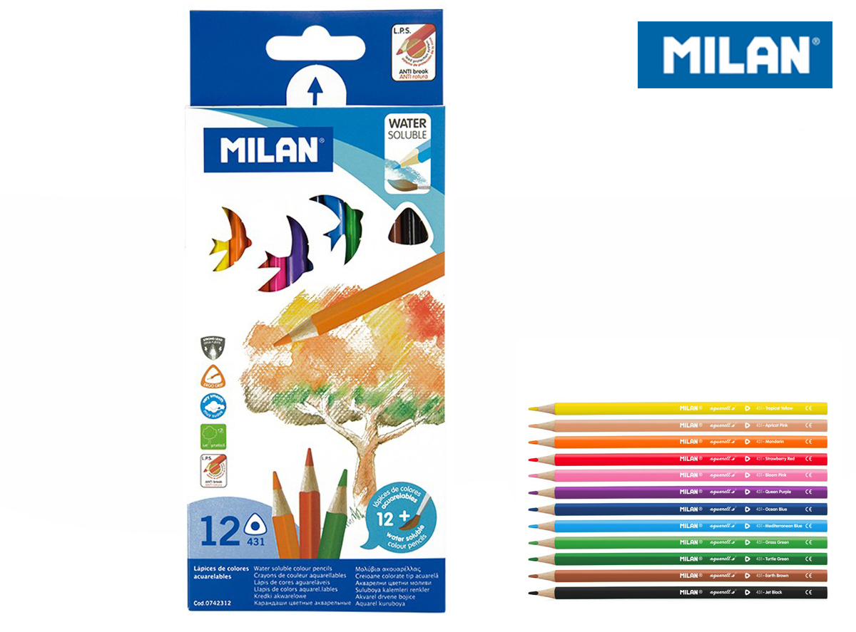 Trójkątne kredki akwarelowe. System ochrony rysika LPS zwiększający odporność na złamanie. Wysokiej jakości pigmenty w żywych, intensywnych kolorach, odporne na działanie światła. Kreska wykonana kredką MILAN jest miękka, jednolita o wyraźnym odcieniu. Nie tworzy rowków ani nie niszczy papieru. Opakowanie 24 kolorów + pędzel.