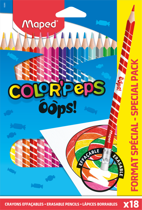 Kredki ścieralne Color'Peps OOPS z białą gumką. Wykonane z żywicy syntetycznej, co wpływa na jakość korpusu - jest elastyczny i giętki. Trójkątny, ergonomiczny przekrój zapewnia poprawny chwyt. Łatwe do temperowania - nie strzępią się i nie zostawiają drzazg. Wzmocniony grafit o przekroju 2,9 mm jest odporny na kruszenie oraz łamanie i doskonale się temperuje. Intensywne, nasycone kolory. Wyprodukowane zgodnie z wszystkimi regulacjami dotyczącymi produktów dla dzieci. 18 sztuk pakowane w praktyczne, kartonowe etui. J.S.:1 etui