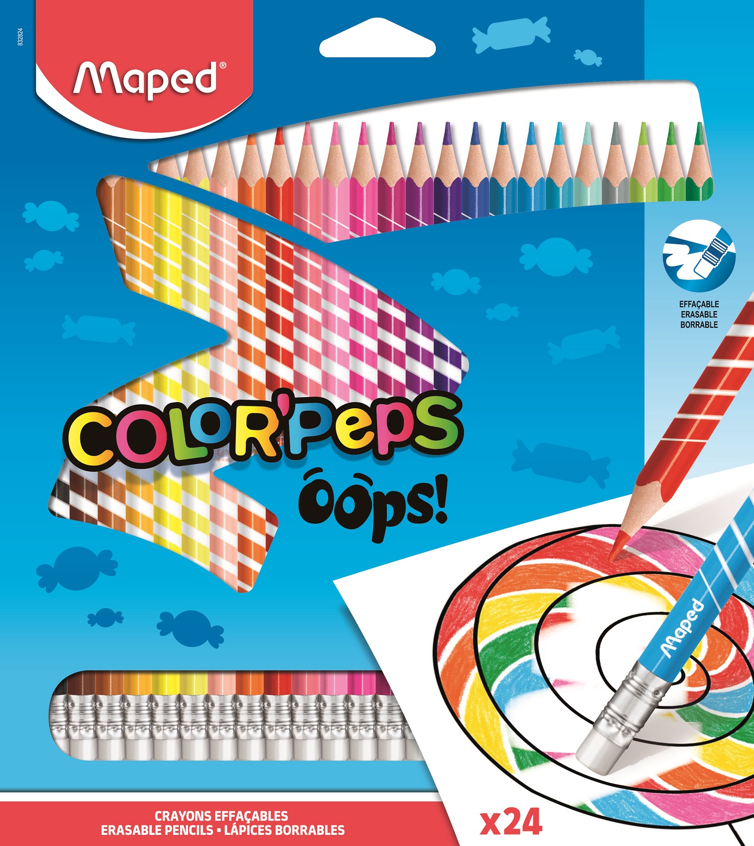Kredki ścieralne Color'Peps OOPS z białą gumką. Wykonane z żywicy syntetycznej co wpływa na jakość korpusu - jest elastyczny i giętki. Trójkątny, ergonomiczny przekrój zapewnia poprawny chwyt. Łatwe do temperowania - nie strzepią się i nie zostawiają drzazg. Wzmocniony grafit o przekroju 2,9 mm jest odporny na kruszenie oraz łamanie i doskonale się. Intensywne, nasycone kolory. Wyprodukowane zgodnie z wszystkimi regulacjami dotyczącymi produktów dla dzieci. 24 sztuki pakowane w praktyczne, kartonowe etui.